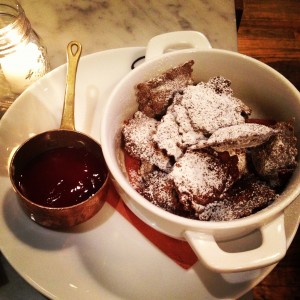 Chocolate ravioli with raspberry coulis